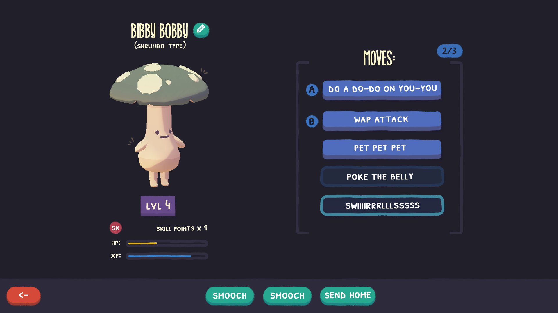 It turns out that a big part of creature collection games is the collecting part, so that's now been added! After you defeat a wild moblet, you'll have an opportunity to befriend it by offering it friendfruit. If you have enough, it will join your crew.