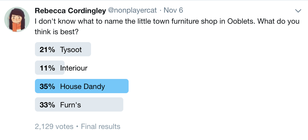 This is the new furniture shop that we're probably going to call Tysoot, which stands for "Things You Sit On and Other Things". We ran a poll with a few names but we didn't like the results so WE IGNORED THEM and went with our favorite.